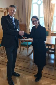 Begge årsmeldinger ble overrakt stortingspresident Tone Wilhelmsen Trøen av Aage Thor Falkanger