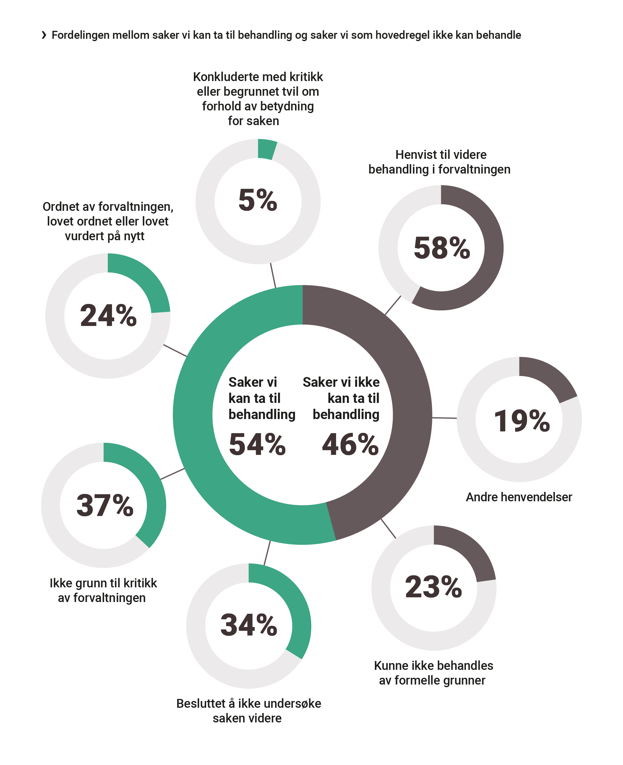I en stor andel av klagene, 27 %, kan vi ikke behandle klagen fordi klageren ikke har brukt alle klagemulighetene i forvaltningen først. Sivilombudets vurdering skal først skje etter at forvaltningen har fått anledning til å rette opp i saken selv. I slike tilfeller viser vi normalt klageren videre til riktig instans, og informerer om at han eller hun kan komme tilbake til oss senere hvis saken fremdeles ikke er løst. At denne andelen saker er så høy, sier oss noe om hvor uoversiktlig forvaltningssystemet kan fremstå for den enkelte. Vi vil jobbe videre med veiledning på dette området, og hente erfaringer fra våre nordiske naboer.
